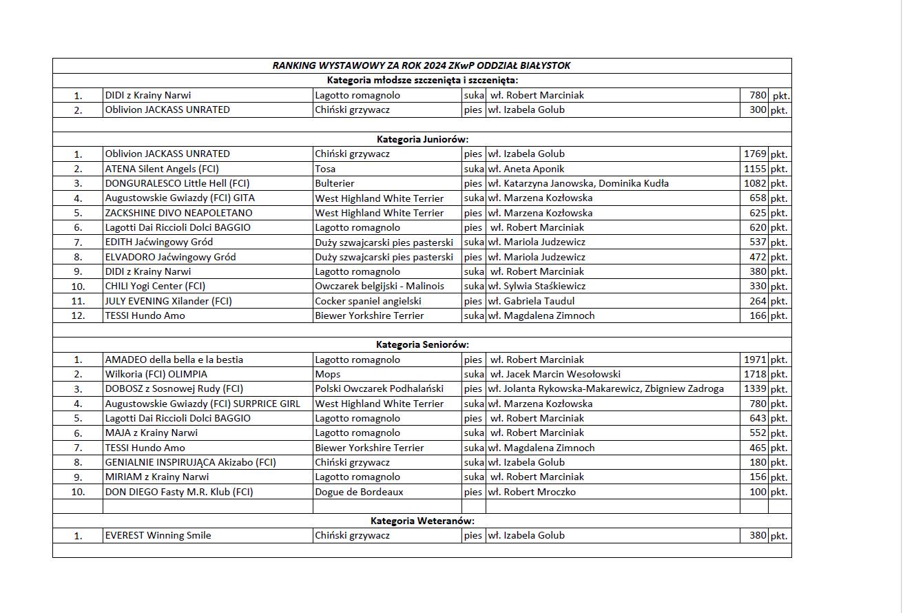 Ranking Wystawowy Oddziału w Białymstoku za rok 2024 – Wyniki: